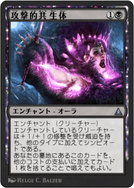エンチャントしているクリーチャーは+1/+1の修整を受け威迫を持ち、他のタイプに加えてシンビオートである。