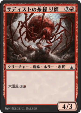 HOME > PRODUCTS > カードギャラリー > 領界路の彼方 CARD GALLERY 『領界路の彼方』のカード 《サディストの糸繰り師》 Creature - Spider Horror Citizen 4 / 3 大混乱{1R} Mayhem (You may cast this card from your graveyard for if you discarded it this turn. Timing rules still apply.) カードテキストは印刷カードのテキストをもとにしています。 『領界路の彼方』のカード一覧