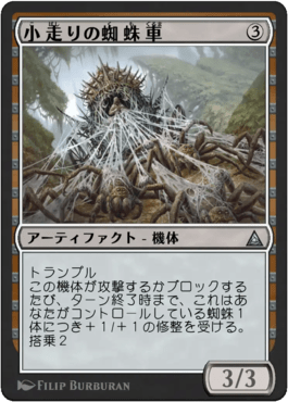 この機体が攻撃するかブロックするたび、ターン終了時まで、これはあなたがコントロールしている蜘蛛1体につき+1/+1の修整を受ける。