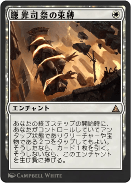 あなたの終了ステップの開始時に、あなたがコントロールしていてアンタップ状態でありクリーチャーや宝物である2つをタップしてもよい。そうしたなら、カード1枚を引く。そうしないなら、このエンチャントを生け贄に捧げる。