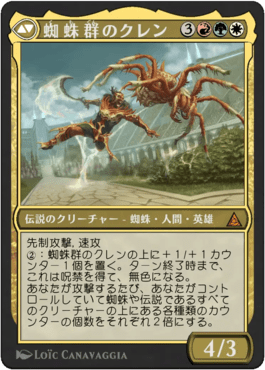 あなたが攻撃するたび、あなたがコントロールしていて蜘蛛や伝説であるすべてのクリーチャーの上にある各種類のカウンターの個数をそれぞれ2倍にする。