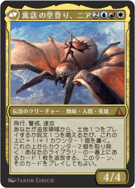 Flying, vigilance, hasteWhenever you play a land from exile or cast a spell from exile, put a +1/+1 counter on Nia.Remove two counters from Nia: Exile the top card of your library. You may play that card this turn.