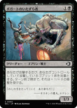 あなたが攻撃するたび、あなたがコントロールしていて攻撃しているゴブリン1体を対象とする。ターン終了時まで、それは+1/+0の修整を受ける。