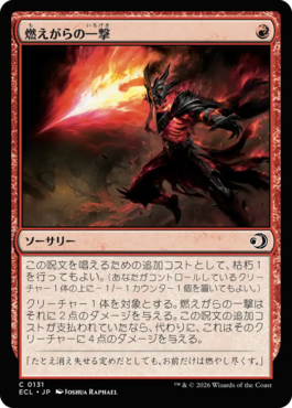クリーチャー1体を対象とする。燃えがらの一撃はそれに2点のダメージを与える。この呪文の追加コストが支払われていたなら、代わりに、これはそのクリーチャーに4点のダメージを与える。