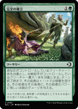 あなたがコントロールしているクリーチャー1体を対象とし、対戦相手がコントロールしているクリーチャー最大1体を対象とする。ターン終了時まで、その前者は+1/+0の修整を受ける。その前者はその後者に、その前者のパワーに等しい点数のダメージを与える。