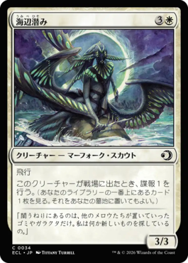 このクリーチャーが戦場に出たとき、諜報1を行う。(あなたのライブラリーの一番上にあるカード1枚を見る。それをあなたの墓地に置いてもよい。)