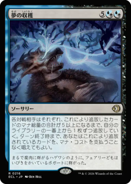 各対戦相手はそれぞれ、これにより追放したカードのマナ総量の合計が5以上になるまで、自分のライブラリーの一番上から1枚ずつ追放していく。ターン終了時まで、あなたはこれにより追放されているカードを、マナ・コストを支払うことなく唱えてもよい。