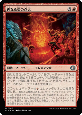 フラッシュバック―{1R}, エレメンタル3つの後見を受ける。(あなたの墓地にあるこのカードをフラッシュバック・コストで唱えてもよい。その後、これを追放する。エレメンタルの後見を受けるとは、あなたがコントロールしているエレメンタル1体を選ぶか、あなたの手札にあるエレメンタル・カード1枚を公開することである。)