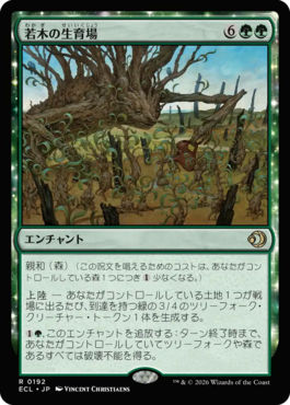 上陸 ― あなたがコントロールしている土地1つが戦場に出るたび、到達を持つ緑の3/4のツリーフォーク・クリーチャー・トークン1体を生成する。