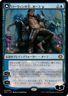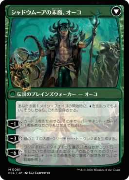 . If you do, transform Oko.−1: Mill three cards. You may put a permanent card from among them into your hand.−3: Create two 3/3 green Elk creature tokens.−6: Choose a creature type. You get an emblem with "Creatures you control of the chosen type get +3/+3 and have vigilance and hexproof."