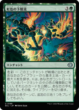 色彩 ― このエンチャントが戦場に出たとき、あなたのライブラリーから基本土地・カード最大X枚を探す。Xは、あなたがコントロールしているパーマネントの中の色の種類数に等しい。それらのカードを公開し、あなたの手札に加える。その後、ライブラリーを切り直す。