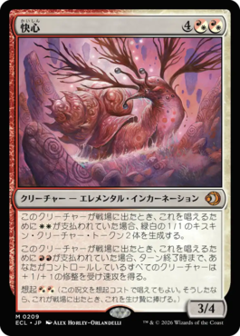 このクリーチャーが戦場に出たとき、これを唱えるために{RR}が支払われていた場合、ターン終了時まで、あなたがコントロールしているすべてのクリーチャーは+1/+1の修整を受け速攻を得る。