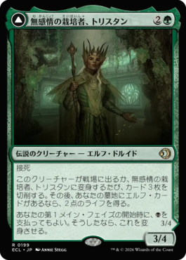 このクリーチャーが戦場に出るか、無感情の栽培者、トリスタンに変身するたび、カード3枚を切削する。その後、あなたの墓地にエルフ・カードがあるなら、2点のライフを得る。