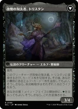 このクリーチャーが改悛の淘汰者、トリスタンに変身するたび、カード3枚を切削する。その後、あなたの墓地にあるエルフ・カード1枚を追放してもよい。そうしたなら、各対戦相手はそれぞれ2点のライフを失う。