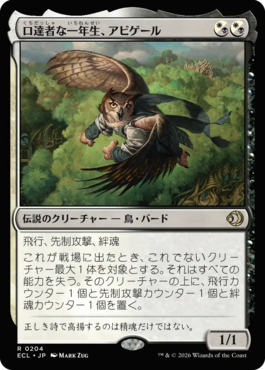 Flying, first strike, lifelinkWhen Abigale enters, up to one other target creature loses all abilities. Put a flying counter, a first strike counter, and a lifelink counter on that creature.