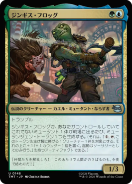 ジンギス・フロッグか、あなたがコントロールしていてこれでないミュータント1体が戦場に出るたび、ミュータンジェン・トークン1つを生成する。(それは、「{1}, {T}, このトークンを生け贄に捧げる:クリーチャー1体を対象とする。それの上に+1/+1カウンター1個を置く。起動はソーサリーとしてのみ行う。」を持つアーティファクトである。)