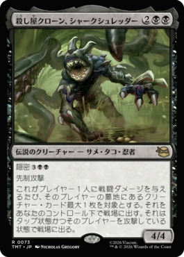 First strikeWhenever Shark Shredder deals combat damage to a player, put up to one target creature card from that player's graveyard onto the battlefield under your control. It enters tapped and attacking that player.