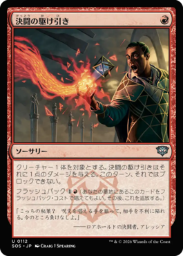 クリーチャー1体を対象とする。決闘の駆け引きはそれに1点のダメージを与える。このターン、それではブロックできない。
