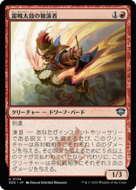 演目 ― あなたがインスタントやソーサリーである呪文1つを唱えるたび、このクリーチャーは各対戦相手にそれぞれ1点のダメージを与える。その呪文を唱えるために5点以上のマナが支払われていたなら、代わりに、このクリーチャーは各対戦相手にそれぞれ3点のダメージを与える。