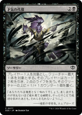 プレイヤー1人を対象とし、クリーチャー最大1体を対象とする。そのプレイヤーはカード2枚を引き、2点のライフを失う。そのクリーチャーの上に+1/+1カウンター1個を置く。