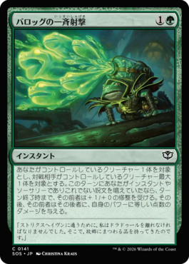 あなたがコントロールしているクリーチャー1体を対象とし、対戦相手がコントロールしているクリーチャー最大1体を対象とする。このターンにあなたがインスタントやソーサリーでありこれでない呪文を唱えていたなら、ターン終了時まで、その前者は+1/+0の修整を受ける。その後、その前者はその後者に、自身のパワーに等しい点数のダメージを与える。