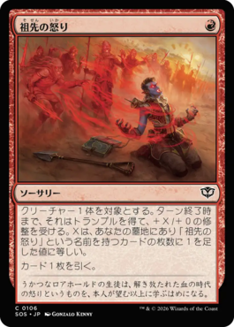 クリーチャー1体を対象とする。ターン終了時まで、それはトランプルを得て、+X/+0の修整を受ける。Xは、あなたの墓地にあり「祖先の怒り」という名前を持つカードの枚数に1を足した値に等しい。