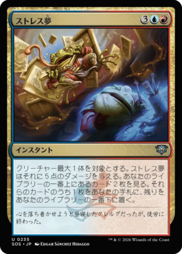 クリーチャー最大1体を対象とする。ストレス夢はそれに5点のダメージを与える。あなたのライブラリーの一番上にあるカード2枚を見る。それらのカードのうち1枚をあなたの手札に、残りをあなたのライブラリーの一番下に置く。