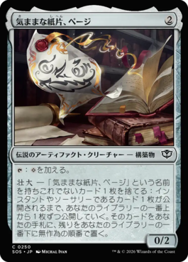 壮大 ― 「気ままな紙片、ページ」という名前を持ちこれでないカード1枚を捨てる:インスタントやソーサリーであるカード1枚が公開されるまで、あなたのライブラリーの一番上から1枚ずつ公開していく。そのカードをあなたの手札に、残りをあなたのライブラリーの一番下に無作為の順番で置く。