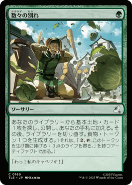 あなたのライブラリーから基本土地・カード1枚を探し、公開し、あなたの手札に加える。その後、ライブラリーを切り直す。食物・トークン1つを生成する。(それは、「{2}, {T}, このトークンを生け贄に捧げる:3点のライフを得る。」を持つアーティファクトである。)
