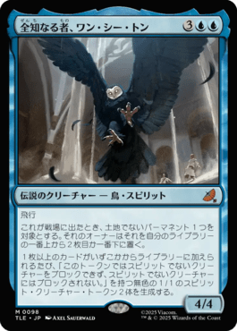 FlyingWhen Wan Shi Tong enters, target nonland permanent's owner puts it into their library second from the top or on the bottom.Whenever one or more cards are put into a library from anywhere, create two 1/1 colorless Spirit creature tokens with "This token can't block or be blocked by non-Spirit creatures."
