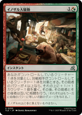 あなたがコントロールしているクリーチャー1体を対象とし、対戦相手がコントロールしているクリーチャー1体を対象とする。その前者のパワーが4以上なら、それの上に+1/+1カウンター1個を置く。その後、その前者とその後者は互いに格闘を行う。(それぞれはもう一方に自身のパワーに等しい点数のダメージを与える。)