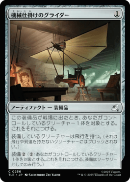 装備しているクリーチャーは飛行を持つ。(それは飛行や到達を持たないクリーチャーにはブロックされない。)