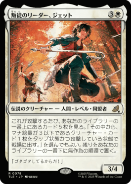 Whenever Jet attacks, look at the top five cards of your library. You may put a creature card with mana value 3 or less from among them onto the battlefield tapped and attacking. Put the rest on the bottom of your library in a random order.