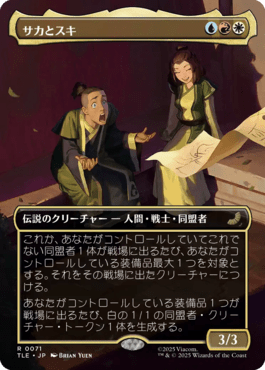 これか、あなたがコントロールしていてこれでない同盟者1体が戦場に出るたび、あなたがコントロールしている装備品最大1つを対象とする。それをその戦場に出たクリーチャーにつける。