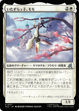 Flying (This creature can't be blocked except by creatures with flying or reach.)When Momo enters, he deals 4 damage to target tapped creature an opponent controls.