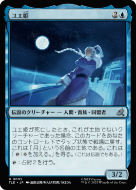 ユエ姫が死亡したとき、これが土地でないクリーチャーであった場合、このカードをあなたのコントロール下でタップ状態で戦場に戻す。これは「月」という名前の土地である。これは「{T}:{C}を加える。」を得る。(これは伝説でもある。)