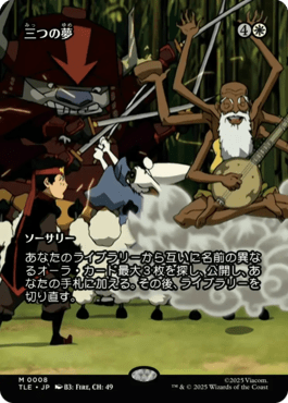 あなたのライブラリーから互いに名前の異なるオーラ・カード最大3枚を探し、公開し、あなたの手札に加える。その後、ライブラリーを切り直す。