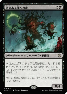あなたの終了ステップの開始時に、カード1枚を引き、枯朽1を行う。(あなたがコントロールしているクリーチャー1体の上に-1/-1カウンター1個を置く。)