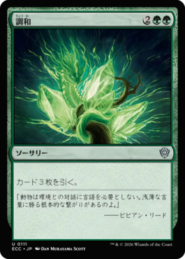 HOME > PRODUCTS > カードギャラリー > ローウィンの昏明 統率者 CARD GALLERY 『ローウィンの昏明 統率者』のカード 《調和》 Sorcery カード3枚を引く。 「動物は環境との対話に言語を必要としない。浅薄な言葉に勝る根本的な繋がりがあるのよ。」 ――ビビアン・リード Draw three cards. カードテキストは印刷カードのテキストをもとにしています。 『ローウィンの昏明 統率者』のカード一覧