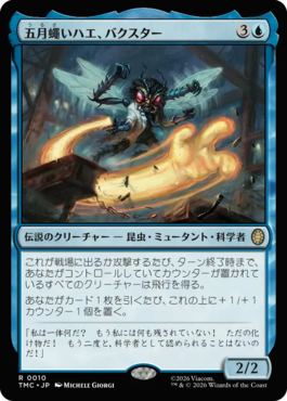 Whenever Baxter enters or attacks, each creature you control with a counter on it gains flying until end of turn.Whenever you draw a card, put a +1/+1 counter on Baxter.