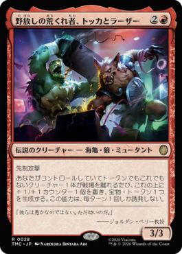 First strikeWhenever another nontoken creature you control leaves the battlefield, put a +1/+1 counter on Tokka & Rahzar and create a Treasure token. This ability triggers only once each turn.