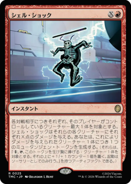 各対戦相手につきそれぞれ、そのプレイヤーがコントロールしているクリーチャー最大1体を対象とする。シェル・ショックはそれらの各クリーチャーにそれぞれX点のダメージを与える。あなたは、これによりダメージを与えられたクリーチャー1体につき1つのミュータンジェン・トークンを生成する。(それらは、「{1}, {T}, このトークンを生け贄に捧げる:クリーチャー1体を対象とする。それの上に+1/+1カウンター1個を置く。起動はソーサリーとしてのみ行う。」を持つアーティファクトである。)