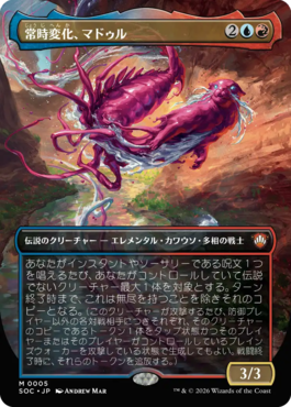 あなたがインスタントやソーサリーである呪文1つを唱えるたび、あなたがコントロールしていて伝説でないクリーチャー最大1体を対象とする。ターン終了時まで、これは無尽を持つことを除きそれのコピーとなる。(このクリーチャーが攻撃するたび、防御プレイヤー以外の各対戦相手につきそれぞれ、そのクリーチャーのコピーであるトークン1体をタップ状態かつそのプレイヤーまたはそのプレイヤーがコントロールしているプレインズウォーカーを攻撃している状態で生成してもよい。戦闘終了時に、それらのトークンを追放する。)