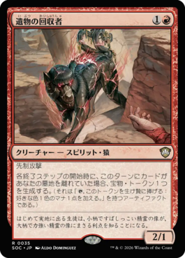 各終了ステップの開始時に、このターンにカードがあなたの墓地を離れていた場合、宝物・トークン1つを生成する。(それは「{T}, このトークンを生け贄に捧げる:好きな色1色のマナ1点を加える。」を持つアーティファクトである。)