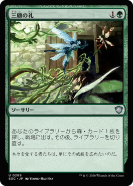 あなたのライブラリーから森・カード1枚を探し、戦場に出す。その後、ライブラリーを切り直す。