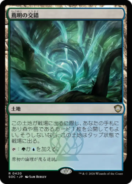 この土地が戦場に出るに際し、あなたの手札にあり森や島であるカード1枚を公開してもよい。そうしないなら、この土地はタップ状態で戦場に出る。