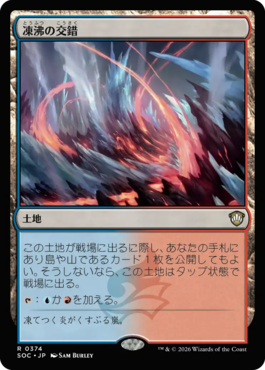 この土地が戦場に出るに際し、あなたの手札にあり島や山であるカード1枚を公開してもよい。そうしないなら、この土地はタップ状態で戦場に出る。
