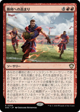 あなたの墓地にありインスタントやソーサリーであるカード1枚を対象とする。それを追放する。ターン終了時まで、あなたがコントロールしているすべてのクリーチャーは+X/+0の修整を受ける。Xは、その追放したカードのマナ総量に等しい。このターン、あなたがコントロールしているクリーチャー1体がプレイヤー1人に戦闘ダメージを与えるたび、その追放されているカードをコピーする。あなたはそのコピーをマナ・コストを支払うことなく唱えてもよい。