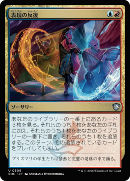 あなたのライブラリーの一番上にあるカード3枚を見る。それらのうち1枚をあなたの手札に加え、それらのうち1枚をあなたのライブラリーの一番下に置き、それらのうち1枚を追放する。このターン、その追放されているカードをプレイしてもよい。