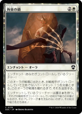 このオーラが戦場に出たとき、対戦相手がコントロールしていて土地でないパーマネント1つを対象とする。このオーラが戦場を離れるまで、それを追放する。
